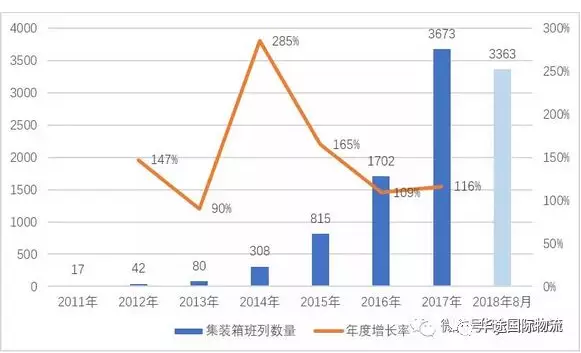中歐班列無疑是中國提出“一帶一路”倡議后,國人踐行這一倡議最有力的詮釋。至今,沒有那個物流市場可以出現(xiàn)這種幾何級數(shù)的增長,從2011年重慶惠普班列開行為標志,8年時間,每年增長率都超過了100%,最跳躍的是2014年,增長率高達285%。從以下數(shù)據(jù)看,中歐班列開始形成燎原之勢的應該是2014年,進入快速增長期的應該是2016年。說中歐班列是新市場、新事物,是探索期,要容許試錯,一點不為過。